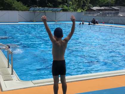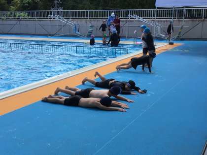 12年生の子供たちはプールで水遊びを行いました。輪くぐりや蹴伸びなど、それぞれコースに分かれて自分の目当てに向かってチャレンジです。