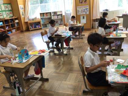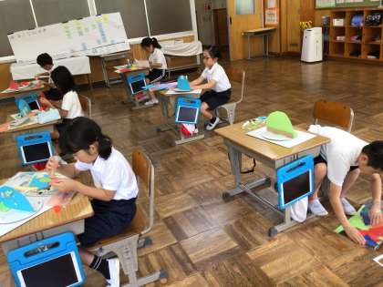 3年生の子供たちは図工の時間に思い思いの作品を作っていました。どんな作品ですか?と問いかけると、目をキラキラさせて、「これはね」と説明してくれます。発想を生かして楽しむことができる学び、いいですね。