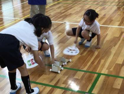 1台の車を両方向から仰いで押しくらまんじゅうをする子供たち、いくつかの車をつなげて走らせようとする子供たち。様子を見ていたスタッフの方にちょっとしたアドバイスをもらい、試してみたいことがができたようです。