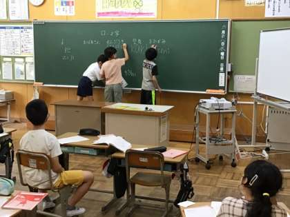 4年生は、ローマ字の書き方の復習をしました。濁音や「シャ・シュ・ショ」のような拗音、「おばあさん→オバーサン」のような、音を伸ばすときの表し方などを書いて、特別な場合の書き方を練習しました。