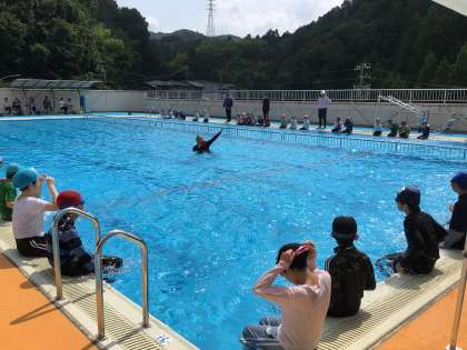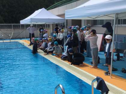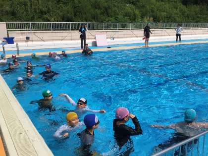 講師の先生からは最初に靴が浮く事を学びます。全員が水の中で靴を脱いで浮かべました。その後、プールサイドに手をかけないまま、全員で水の中を走り、渦をつくります。合図があると反対回りになるので、いつもは体力自慢の子供たちも、重労働の様子でした。