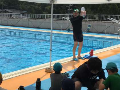 先生がペットボトルを使った「浮いて待て」のポーズを教えてくれました。