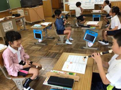 3年生は、リコーダーの練習をしていました。吹き込む息の強さに気をつけて、きれいな音でふいたり、タンギングを使いながら、リズムを刻んだりしていました。ペアで練習したらとても上手くなりました。良いアドバイスをもらったんですね。