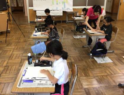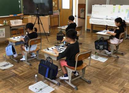3年生は、書写で「ぼきん」を書いていました。ひらがなの3文字は、一文字が小さくなるので書くのが難しいですが、バランスをよく見ながら書いていました。小筆で、自分の名前を書く練習もして、筆遣いがどんどん上達しています。