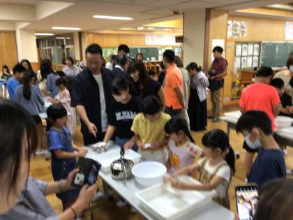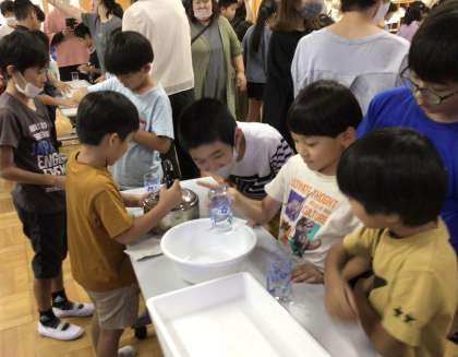 写真はコップの水も紙でこぼれないという実験です。見事成功した子がいると、グループからは拍手が沸き起こりました。