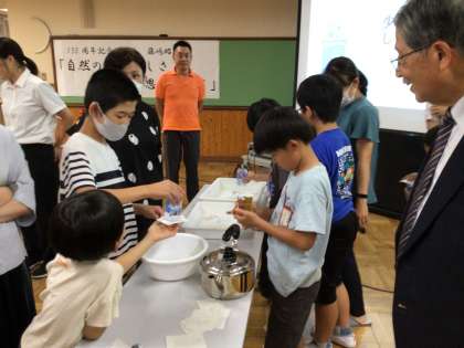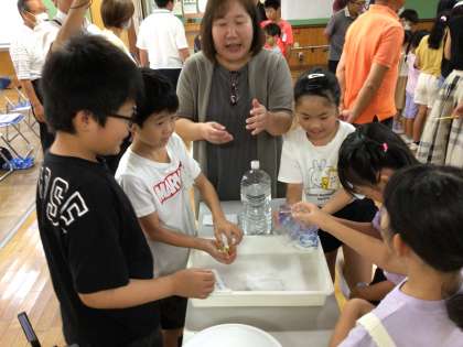 コップの水も紙でこぼれないの実験では、あちこちから歓声が上がっていました。