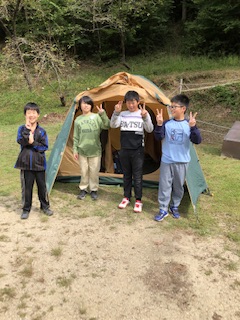 六所で今年初めて立てられたテント。一晩の手作りの家の前でポーズをとりました。ぐっすり眠れたのかな。