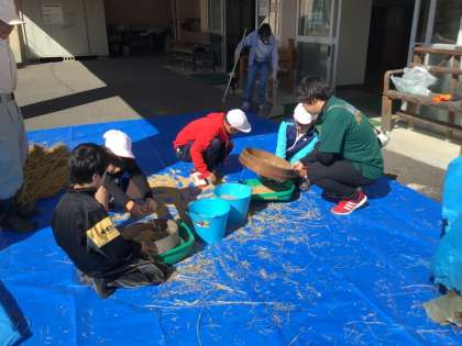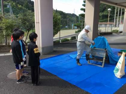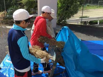 5年生は、先日刈った稲の脱穀作業をしました。昔ながらの足踏み式脱穀機を使っての作業で、勢いよく回る脱穀機の中に稲穂を入れると、どんどん脱穀されていきました。機械で取れなかった分は手で取って、少しも無駄にしないようにしていました。