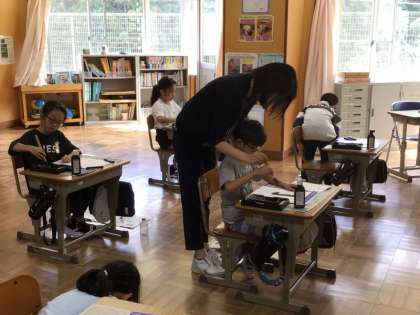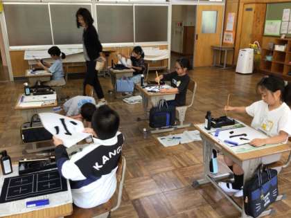 3年生の書写は「小」の文字で練習をしていました。めあては、「はねの向きと点の長さに気をつけて書こう」です。毛筆は、筆の流れを気にしながら書くと形がよくなります。空中の筆の動きを気にしながら、みんな書いていました。
