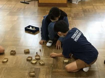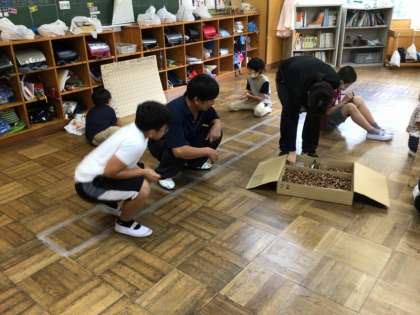 4年生は、総合で環境に関することを学んでいます。今日は、どんぐりを使ったコマ作りに挑戦していました。どのどんぐりがよく回りそうか、いくつか作って試して、自分のコマを決めて競争をしていました。