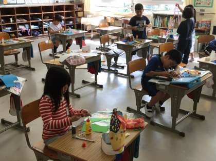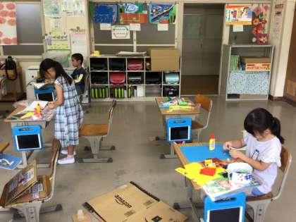 2年生は、図工の学習で、輪を使った飾りを作って変身をする作品作りに取り組んでいます。頭にかぶるもの、体につけるもの、想像を膨らませながらの飾り作りです。完成したら、どんな変身ができるのでしょうか。
