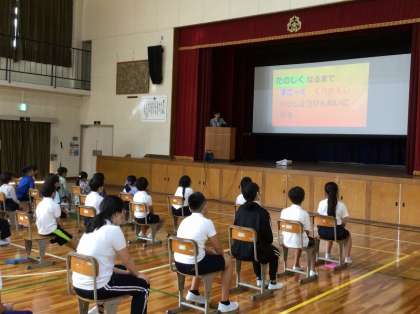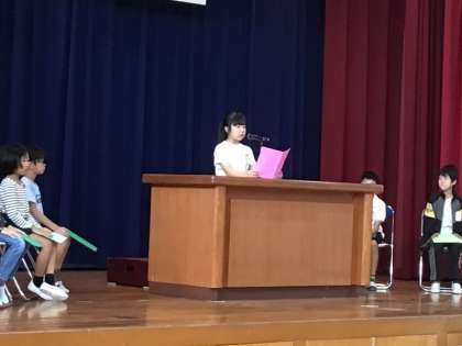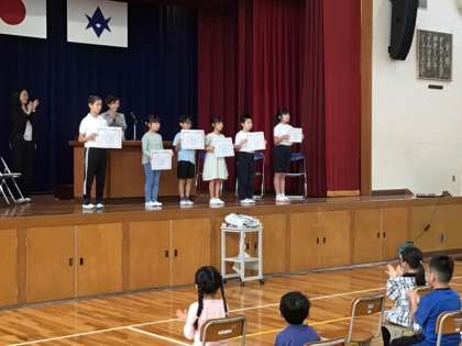 表彰の後の始業式では、はじめに各学級の代表が、前期を振り返って後期にがんばっていきたいことを発表しました。みんな立派に発表をしていました。校長先生の話では、「○○なるまで、すごーく くりかえし いっしょうけんめいにやる」にあてはまる言葉を、子供たちが友達と話し合い、「これだ」という言葉を伝えていました。