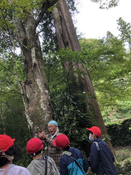 古い杉の木では、200年前のものもあり、江戸時代と言うワードも飛び出ました。空にそびえ立つ立派な木でした。幸海小学校の近くでもたくさん見られたコナラのどんぐりも拾いました。今年は例年に比べ数が少ないそうです。子供たちは来週も森林講座第2回として、北岡先生から学びます。