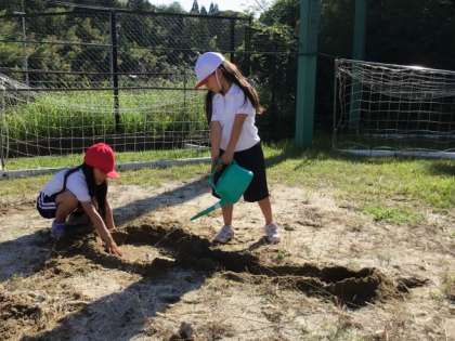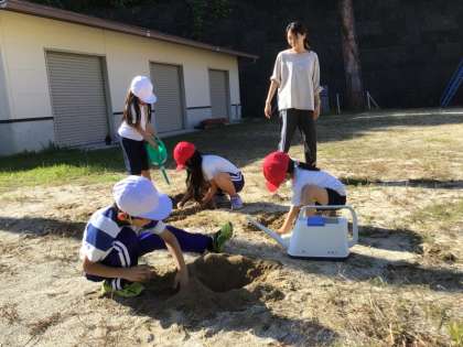 1年生の大きな声が外から聞こえたので、運動場に出てみました。図工の授業で、砂に親しむ活動をしていました。深く掘ったり、水を流したり、手に砂をいっぱいつけながら思い思いに活動を続け、楽しんでいました。