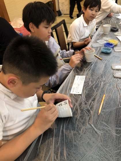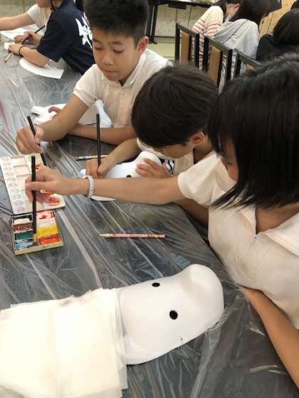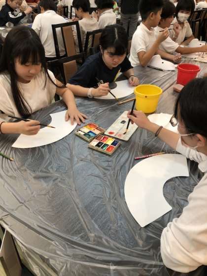 扇子、お面、湯のみの絵付けをそれぞれの個性に合わせて作成した子供たち。大満足の作品になったかな。