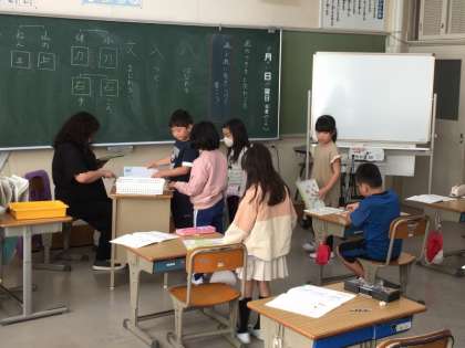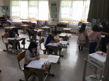 2年生は、書写で「画と画に気を付けて書こう」をめあてに学習をしていました。「八」のように、画が離れる字。「入」のように、画がつく字。「交」のように、画が交わる字。画はどうなるのかな、と気をつけながら練習をしていました。