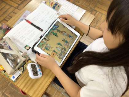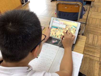 教科書では小さくてよく分からない絵巻を、クローズアップして探りました。水売りや、猿回しなど、今では見かけない町の様子に興味をもつことができました。看板や、持ち物から職業を推理するのが楽しかったですね。