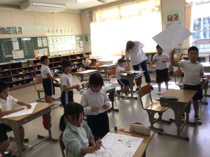 2年生の子供たちは、「くまの校長先生」の読み語りの後、読書感想画を書描いていました。