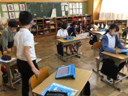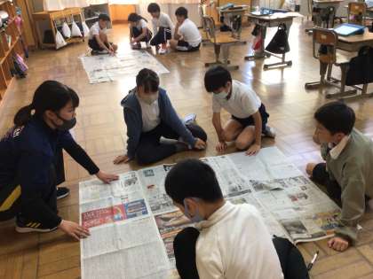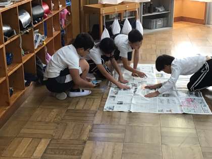 4年生の子供たちは算数の時間に、新聞紙を広げながら1平方メートルを作っていました。