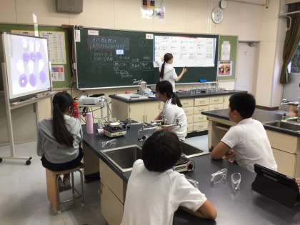 今日は研究授業があったため、6年生の理科の授業を全校の先生で参観しました。
