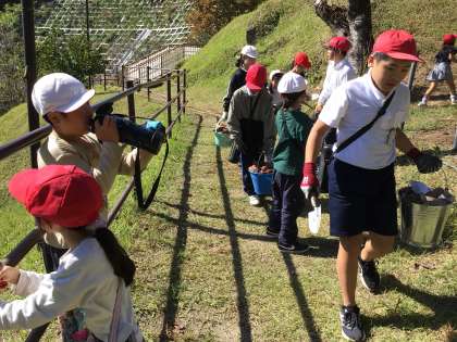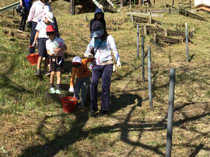 講師の先生にお礼を言って芋の入ったバケツをぶら下げながら帰っていく子供たち。