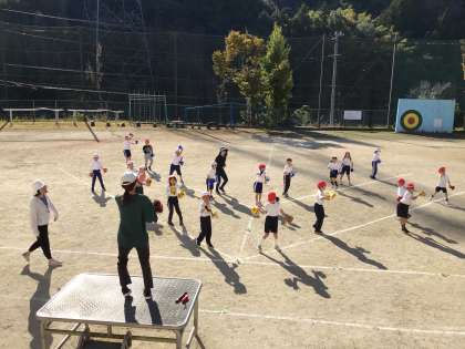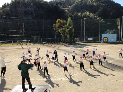 低学年の子供たちが運動場で元気いっぱいにダンスを踊っていました。