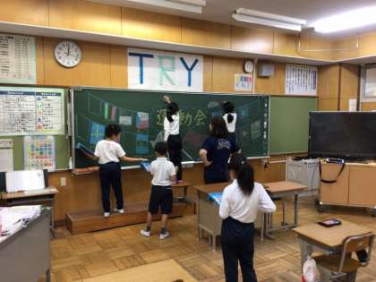 いよいよ運動会本番です。3年生は、運動会がんばろうの気持ちを込めて、黒板に万国旗のイラストを書いていました。運動会といえば、万国旗。気分が盛り上がってきます。自分で、いろいろな国の国旗を調べて、それを見ながらかいていました。国旗の学習にもなりましたね。