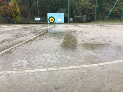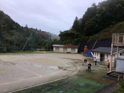 「子供たちが運動会を楽しみにしているんでしょ」の一言で、とにかくやれる事はやってみようという話になりました。雨の中、運動場に出て雨水が流れていくように溝を作り、後は明日6時に集合で確認という、願いしかない昨晩でした。