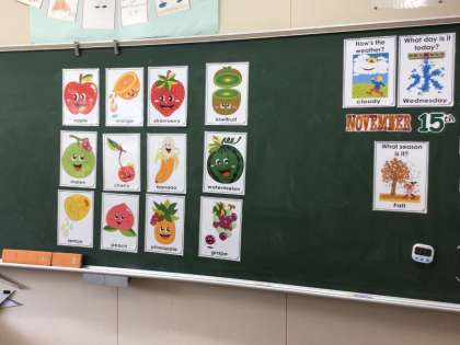 リンゴ(apple)、イチゴ(strawberry)、スイカ(watermelon)など12種類の果物の言い方を練習し、最後はゲームをしました。