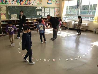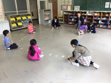 円になるように、果物のイラストがかかれたカードを置き、その周りを歩いて、リーダーが言った果物のカードの前に立ち止まる、というゲームです。どの果物だったかな、リーダーの声を聞いて、果物を探していました。