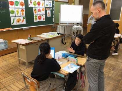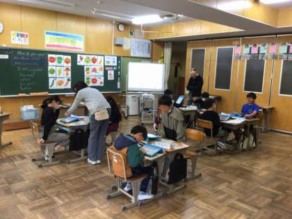 4年生は、ブライアン先生との授業で、野菜や果物の英語での言い方を練習しました。そのあと、「I want 〜,please」を使いながら、友達にほしいものを伝え、「自分が食べたいパフェ」を作る活動に取り組みました。店員役の子は、友達のリクエストは何かよく聞きながら、学習用タブレットを使ってパフェを作っていました。食べたくなるパフェがいくつもできていました。