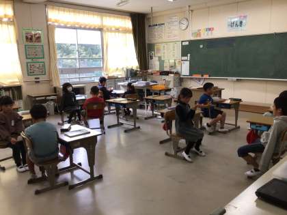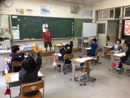 1年生は算数の学習の初めに、ペアで九九の練習をしていました。