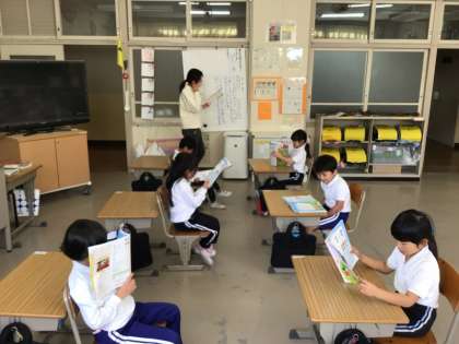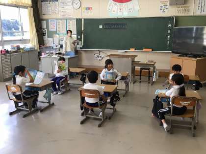 1年生は、音楽でまねっこ遊びを楽しんでいました。先の子が歌ったように、後の子が歌って、まるでやまびこです。よく聞いていないと、ちょっと違う歌になってしまいます。元気な声で、まねっこで歌を歌っていました。