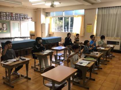 6年生は、音楽で鑑賞をしていました。ただ聞くだけではなく、指揮者のように手が動いています。曲が速くなれば、手の動きも速く、音が小さくなれば、手の動きも小さく。曲の感じに合わせて動かしています。体全体で曲を感じているようでした。