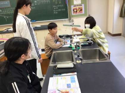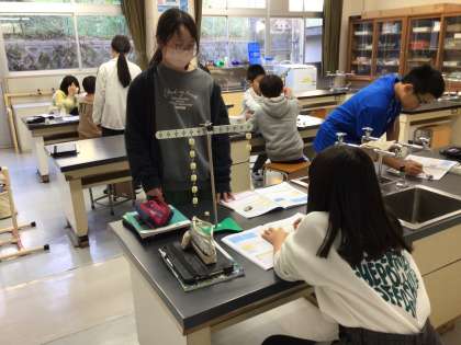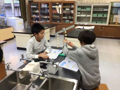 6年生は「おもりを変えて、てこの手ごたえを確かめよう」というめあてで、小グループに分かれて実験をしていました。