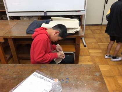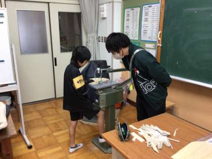 5年生は、電動糸のこを使って、思い通りの形に切ることに挑戦していました。板に描いた下書きの線と刃の向きをよく見て、慎重に板を押し進めていました。曲がった線を切るときや方向を変える時が難しいですが、焦らず、ゆっくりと切っていました。