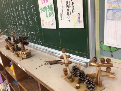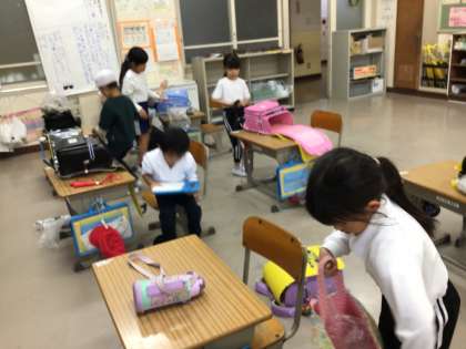 1年生は帰りの準備の真っ最中でした。今日は担任の先生が出張でいないので、いつも準備していることを自分たちで確かめながらやります。