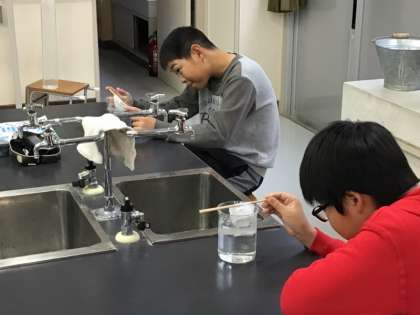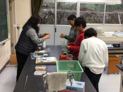 5年生は、「もののとけ方」の学習で、食塩が水に溶ける様子を観察していました。