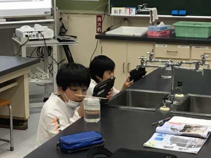 お茶のパックに食塩を入れ、それをビーカーに入れた水に浸しました。すると、すぐに食塩がとけ、ゆらゆらとした筋が見え始めました。「おおっ」と驚いた声が聞こえてきて、すぐにタブレットで写真を撮って記録に残していました。様子を自分で見て確かめられるのは、学びにつながっていきます。
