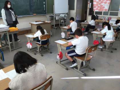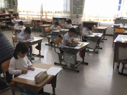 2年生は、書き初めの練習に取り組んでいました。静かに、集中して、お手本をよく見ながら書いていました。書く時の姿勢もよく、いい字を書こうとしている気持ちが伝わってきます。1月の書き初め大会に向けて、一文字一文字しっかりと練習していけそうです。