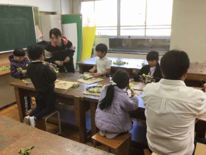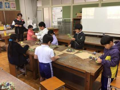1年生は、アサガオのツルを使ってのリース作りをしていました。ツルを束ねて丸くし、そこにきれいな葉をさしていきました。だんだんとカラフルなリースになっています。これから、どんなリースになっていくのか楽しみです。
