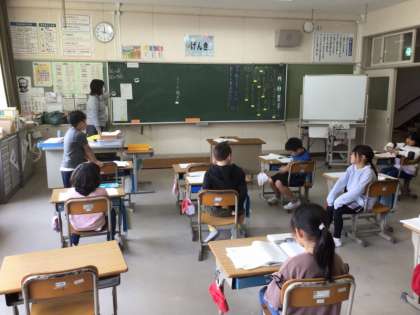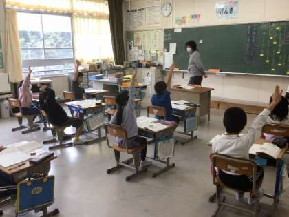 2年生は、国語の授業で、登場人物の気持ちを話し合っていました。「自分の考えを発表したい」という気持ちが、挙げている手に表れています。発表している友達の方に体を向けて、目でも見て聴こうとしていました。心を込めた「聴く」で、聴き名人になっていますね。