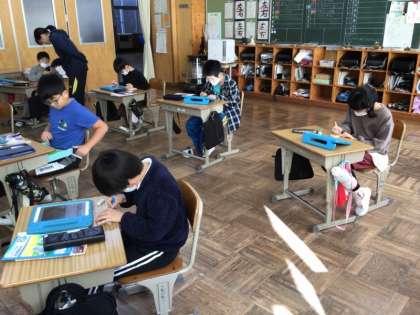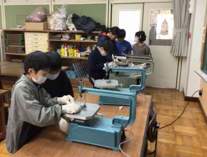 4年生の教室に入ると、いつもとは違うにおいがしました。見てみると、くすのきを使った消臭剤作りに取り組んでいました。まず、くすのきの板にイラストを描き、その後、電動糸のこぎりで形を切り取りました。自分だけの消臭剤の完成です。
