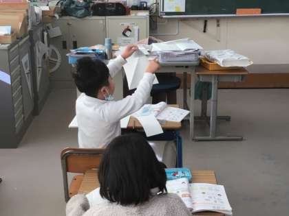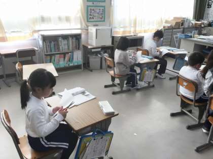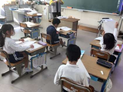 2年生は、「三角形と四角形」の単元で正方形について学習をしていました。紙を折って正方形を作った後、角の様子や辺の長さを、三角定規などを使って調べてました。発見した特徴を、すぐに先生に伝えている子もいました。