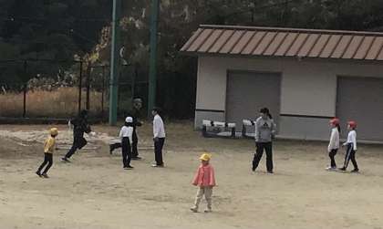 運動場では穏やかな光の中、外遊びを楽しむ子供たちがいました。