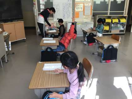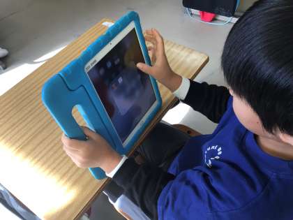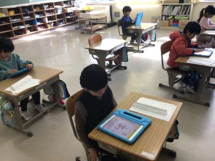 ひらがなを丁寧に書くために、担任の先生が学習用タブレットの「美文字」を使って取り組ませていました。なかなかの厳しさで、クリアができない子供たち。形よく書く意識が高まります。