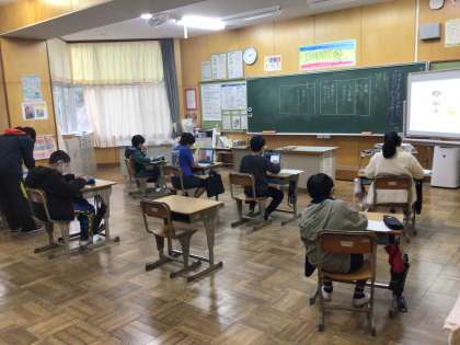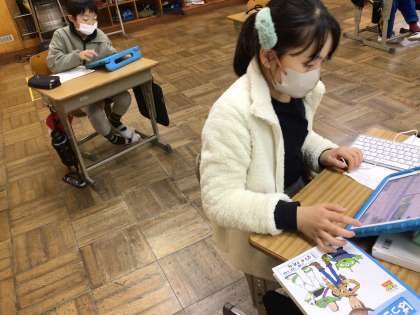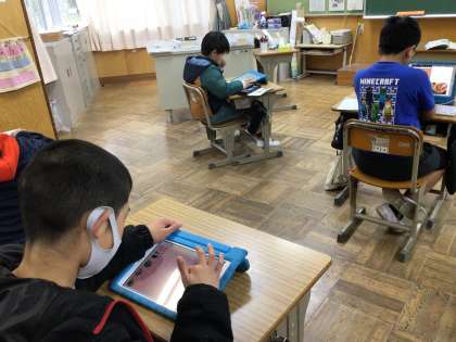 4年生は国語の授業で学習用タブレットを使ってリーフレットを作っています。
