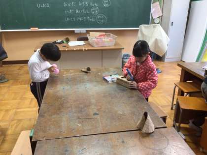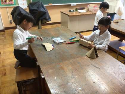 1年生は、図工室で、新1年生に渡すプレゼントを作っていました。箱に色を塗ったり、玉にひもを通したり、コーンの形に曲げていたり。真剣さが伝わってきました。