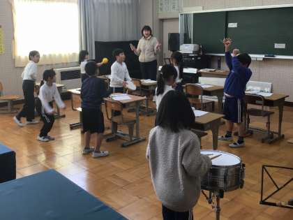 2年生は、音楽室で音楽の学習をしていました。楽しそうな歌声と打楽器の音が聞こえます。最初に歌を歌ったあと、タンバリンや小太鼓、鈴などでリズムを打っています。歌の1番が終わると、次の場所に移動して、別の楽器を鳴らしています。楽しくなって、踊り始める子もいました。