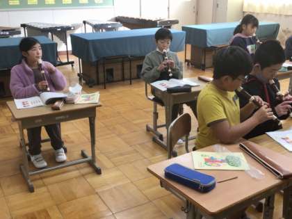 4年生は、音楽室でリコーダーの練習をしていました。曲は「オーラリー」です。高い音が多いので、高音がきれいに出せるかがポイントです。音がきれいになるように、吹き方を工夫しながら練習していました。